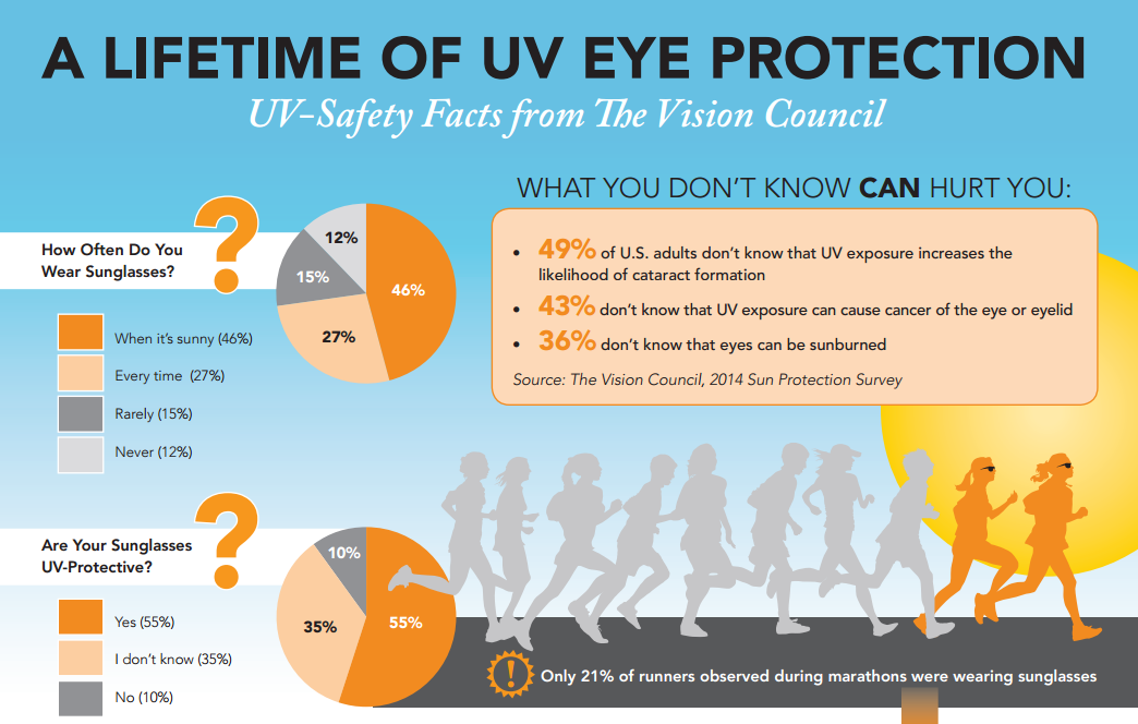 However, exposure to sunlight in long duration can damage the skin. UV-A and UV-B rays can burn the skin and increase the production of melanin. These UV rays can damage the eye in similar ways. Photokeratitis is a condition where the eyes are “sunburned,” causing agonizing and uncomfortable symptoms for a short period of time. Albeit short lengths of time may cause temporary symptoms, longer duration of exposure can lead to permanent damage such as macular degeneration and cataracts just to name a few.